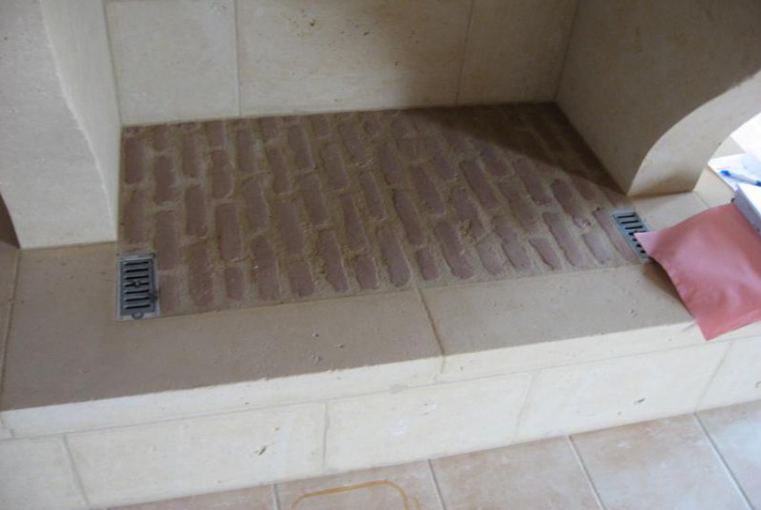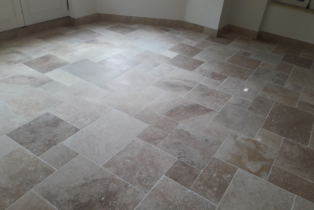 Carrelage en travertin (pierre naturelle) en pose collée sur plancher chauffant.