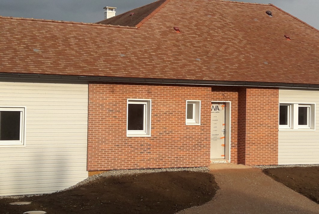 Parement de plaquettes briques en façade de maison à ossature bois.